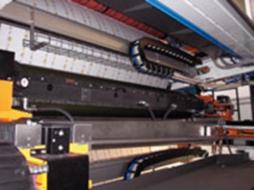 This new cleaning system for the rollers on a printing machine uses an igus® e-chain® of the 14240 series. The requirements on the e-chain® were the very restricted space both in terms of height and width, as well as the demanding environment with paper dust, ink residue and cleaning agents. Use of the e-chain® permits fast cleaning and thus guarantees a high availability of the printing machine.
